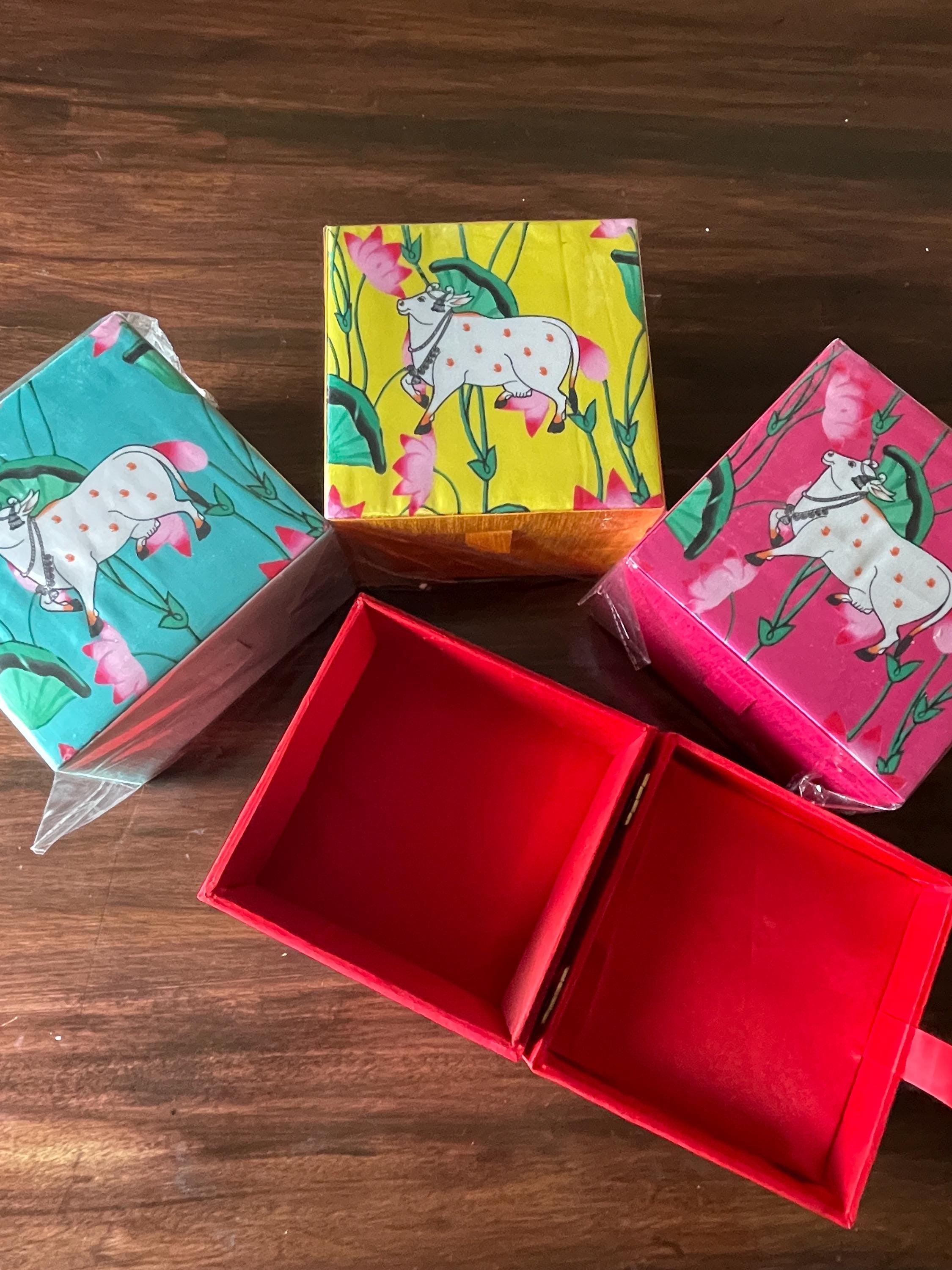 Premium quality silk on wooden gift box decorated Pichwai cow design. Take all 7pcs. size of the box 6" x 6". depth... Read more
